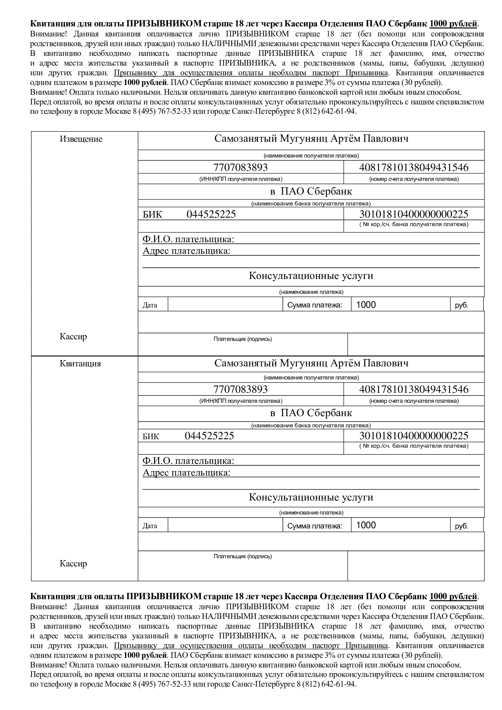 Внимание! Оплачивать услуги необходимо лично ПРИЗЫВНИКУ достигшему 18 лет с именной пластиковой банковской карты ПРИЗЫВНИКА, привязанной к банковскому счету ПРИЗЫВНИКА. Если у призывника нет именной пластиковой банковской карты, то оплата консультационных услуг осуществляется по квитанции через отделения ПАО Сбербанк г. Москвы. Перед оплатой консультационных услуг обязательно свяжитесь с нашим специалистом.
